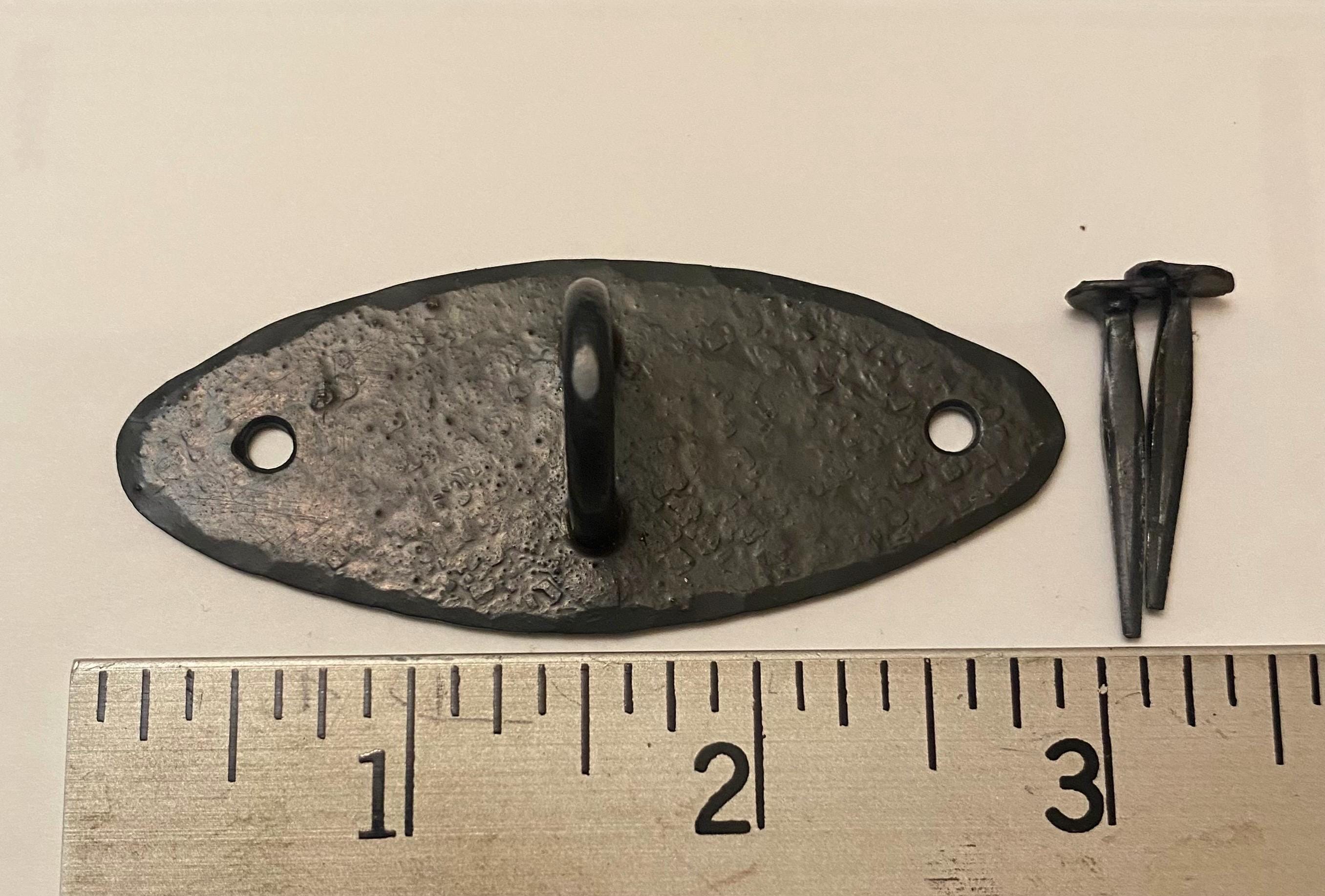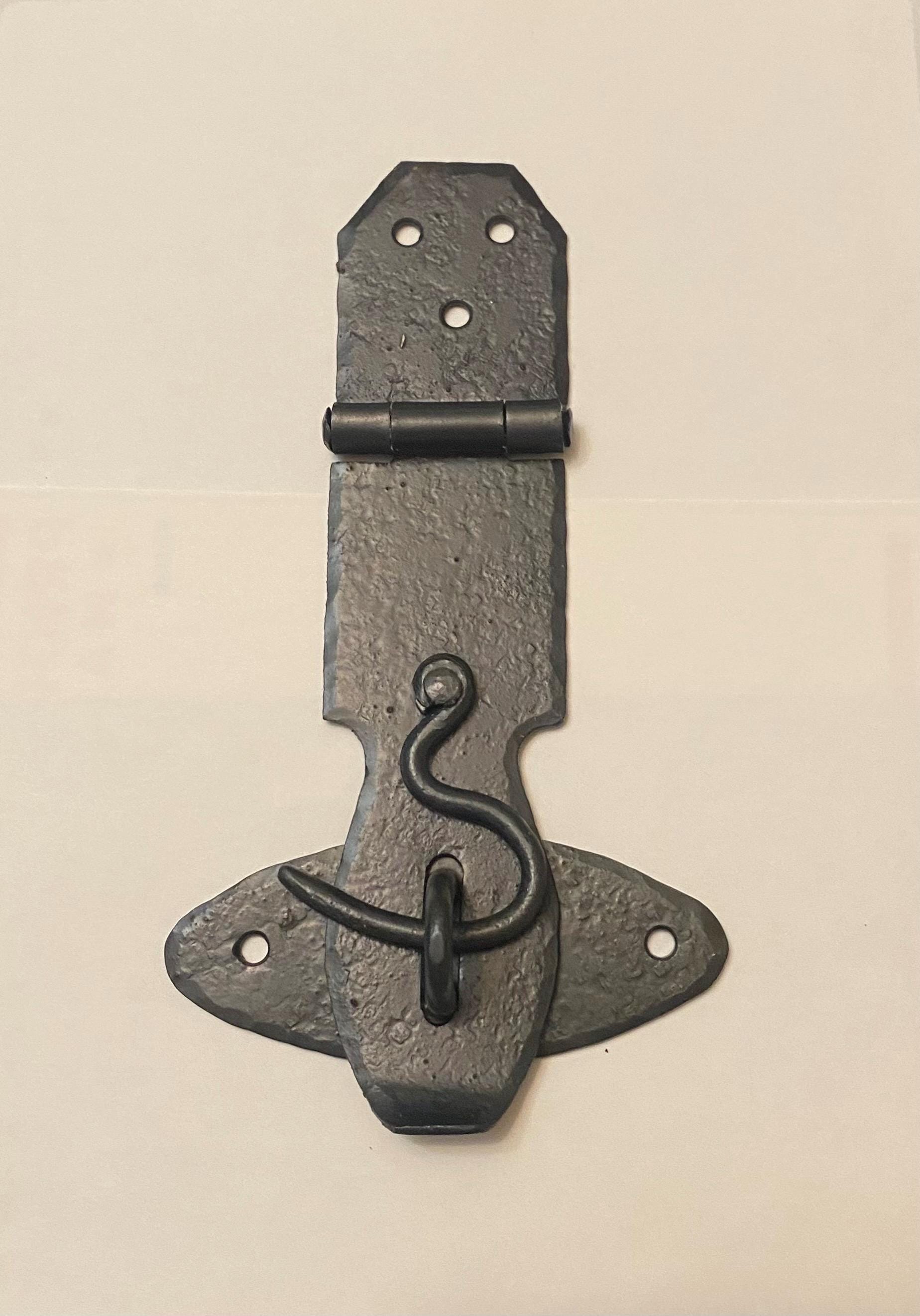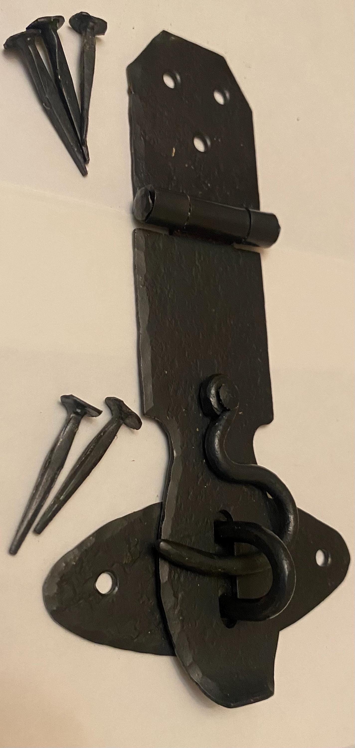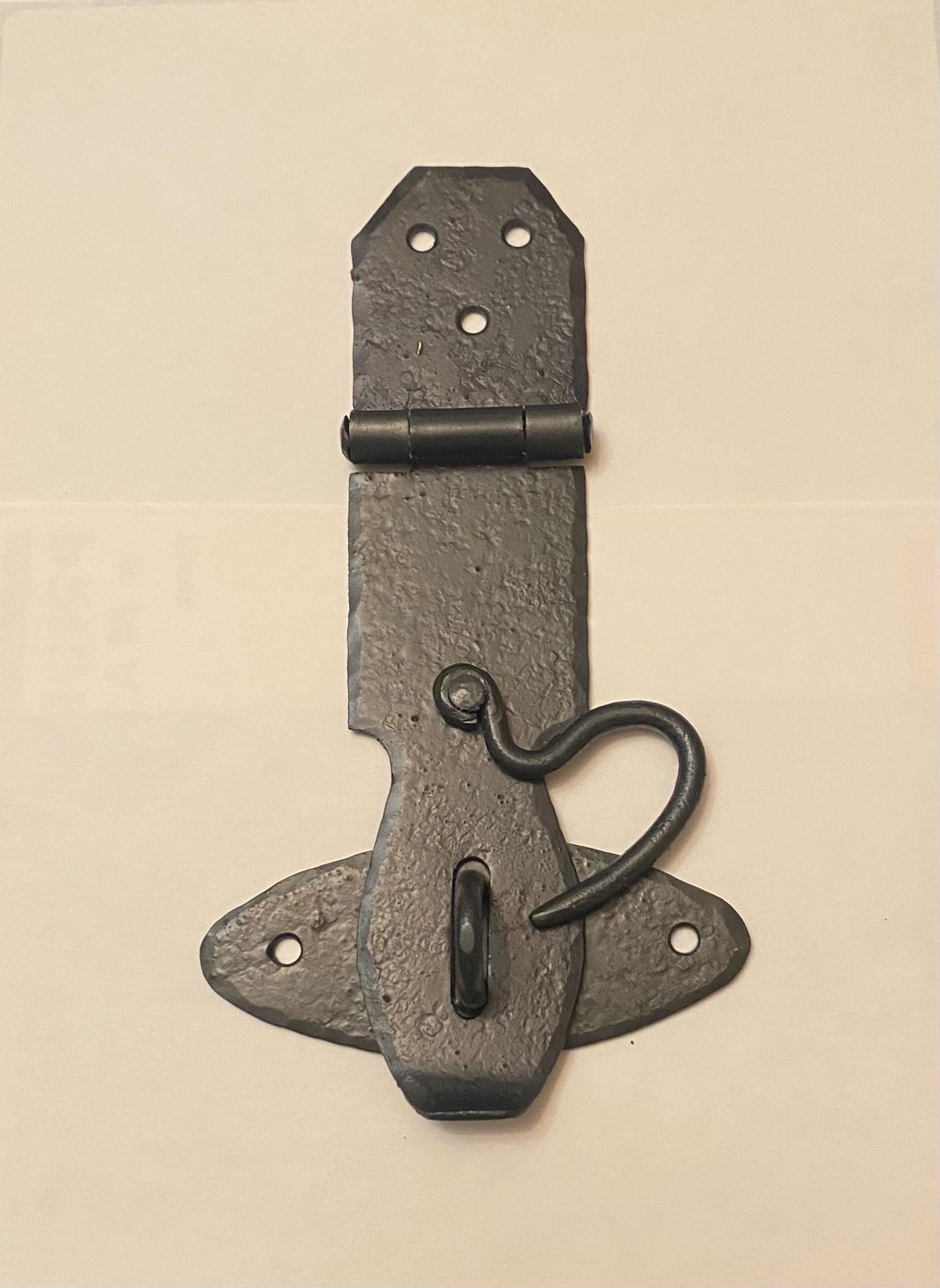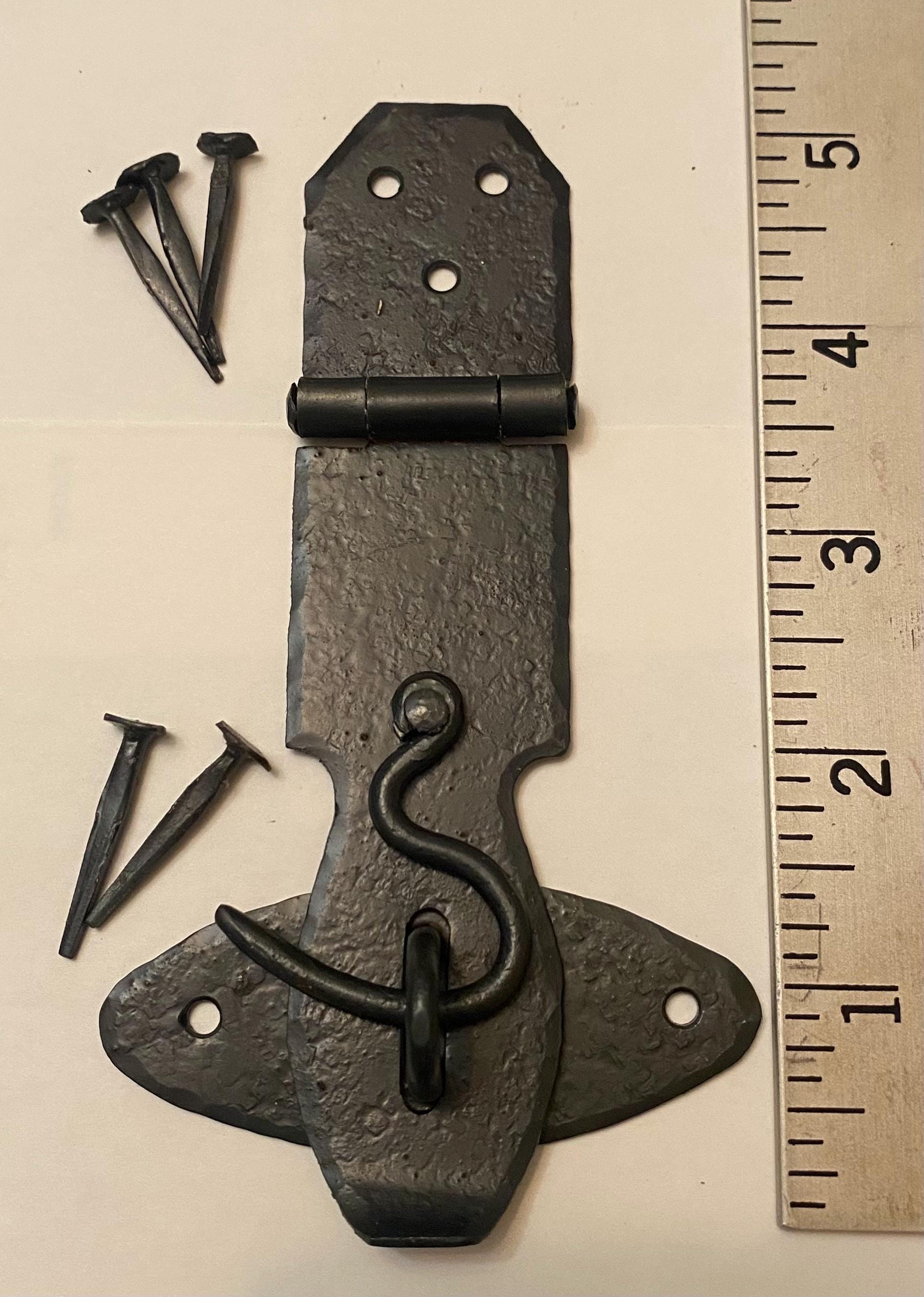 Antique Reproduction Trunk Hardware. This is a padlock hasp with a hook made to fit large and medium size trunks, chests and boxes. Hand Forged right here at The Lock and Box Shoppe, USA. Hasps come with forged head nails for mounting. Please contact me if you would prefer slotted flat head screws or decorative round head screws instead.