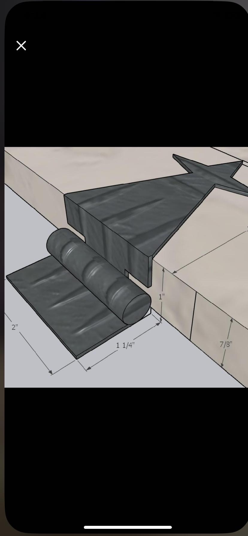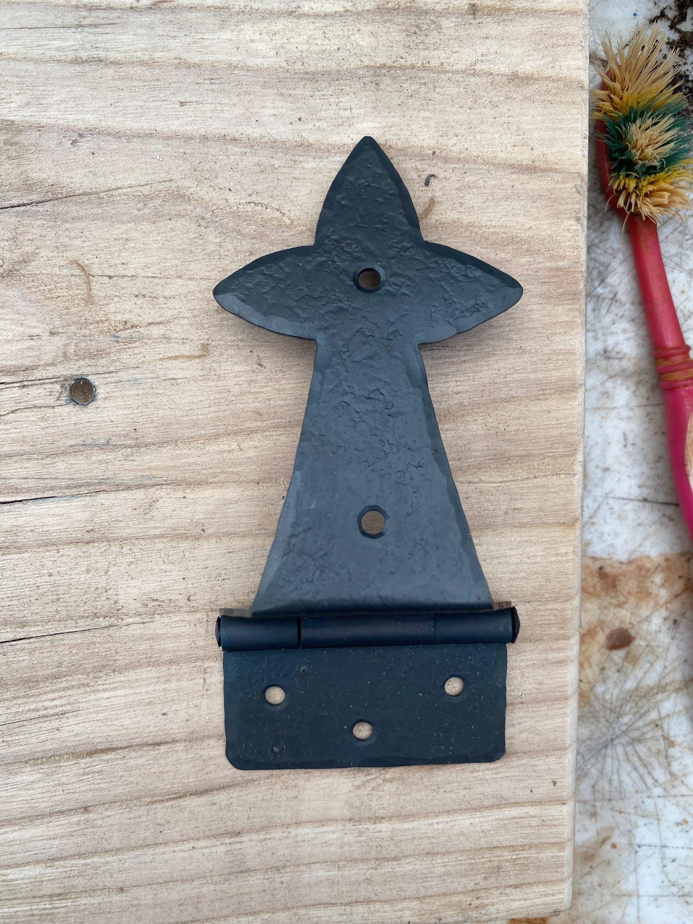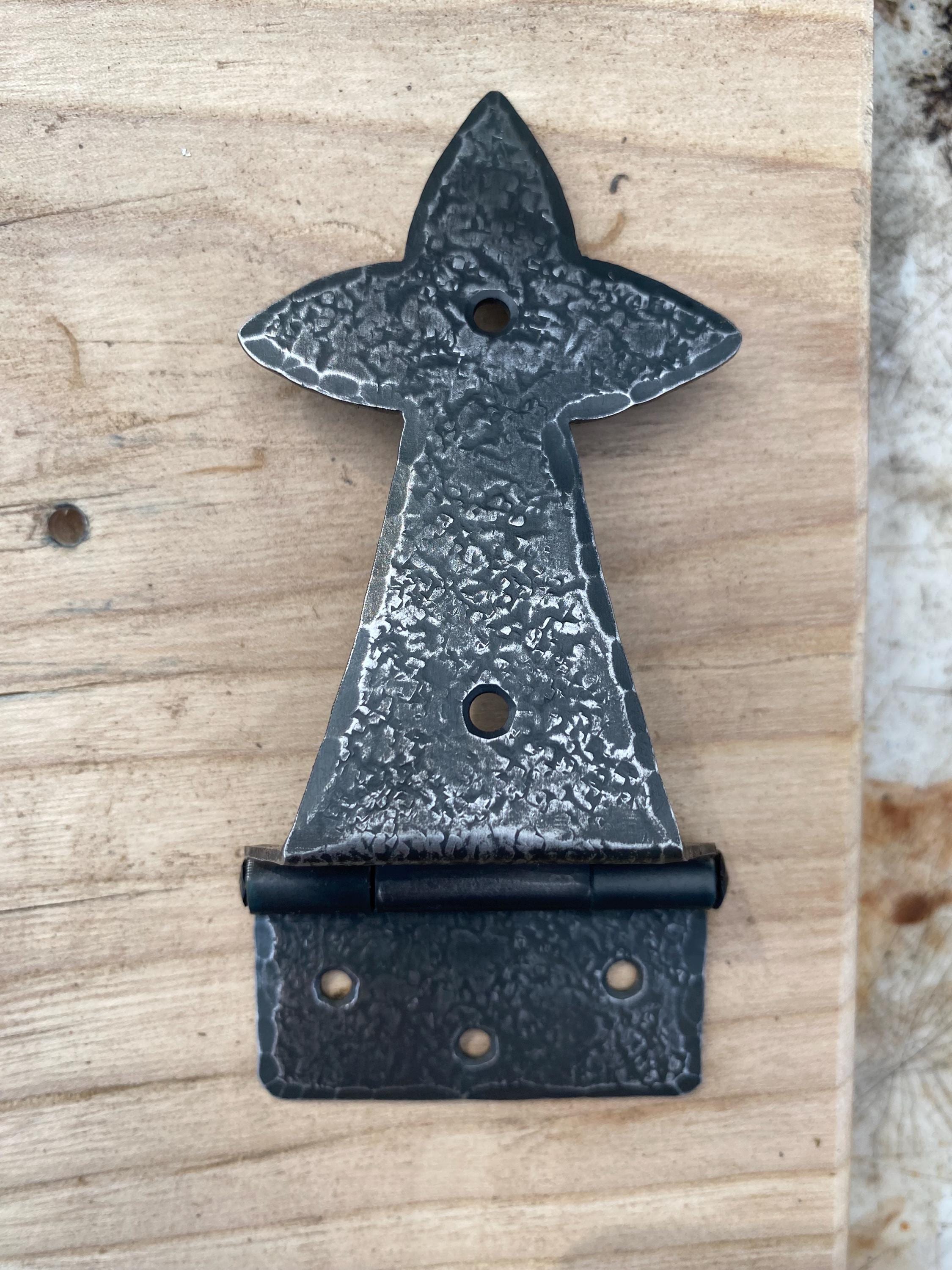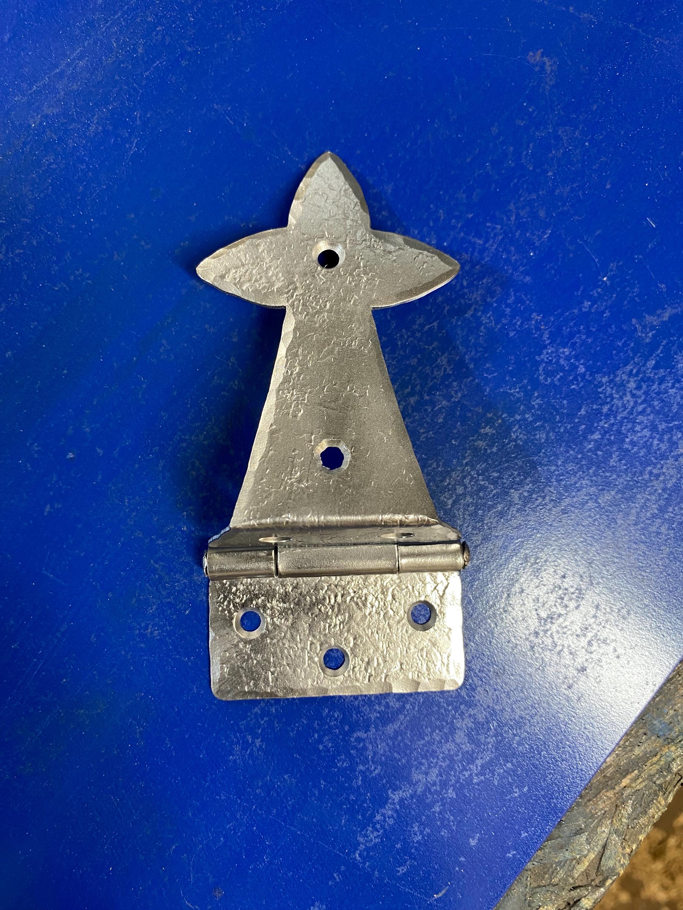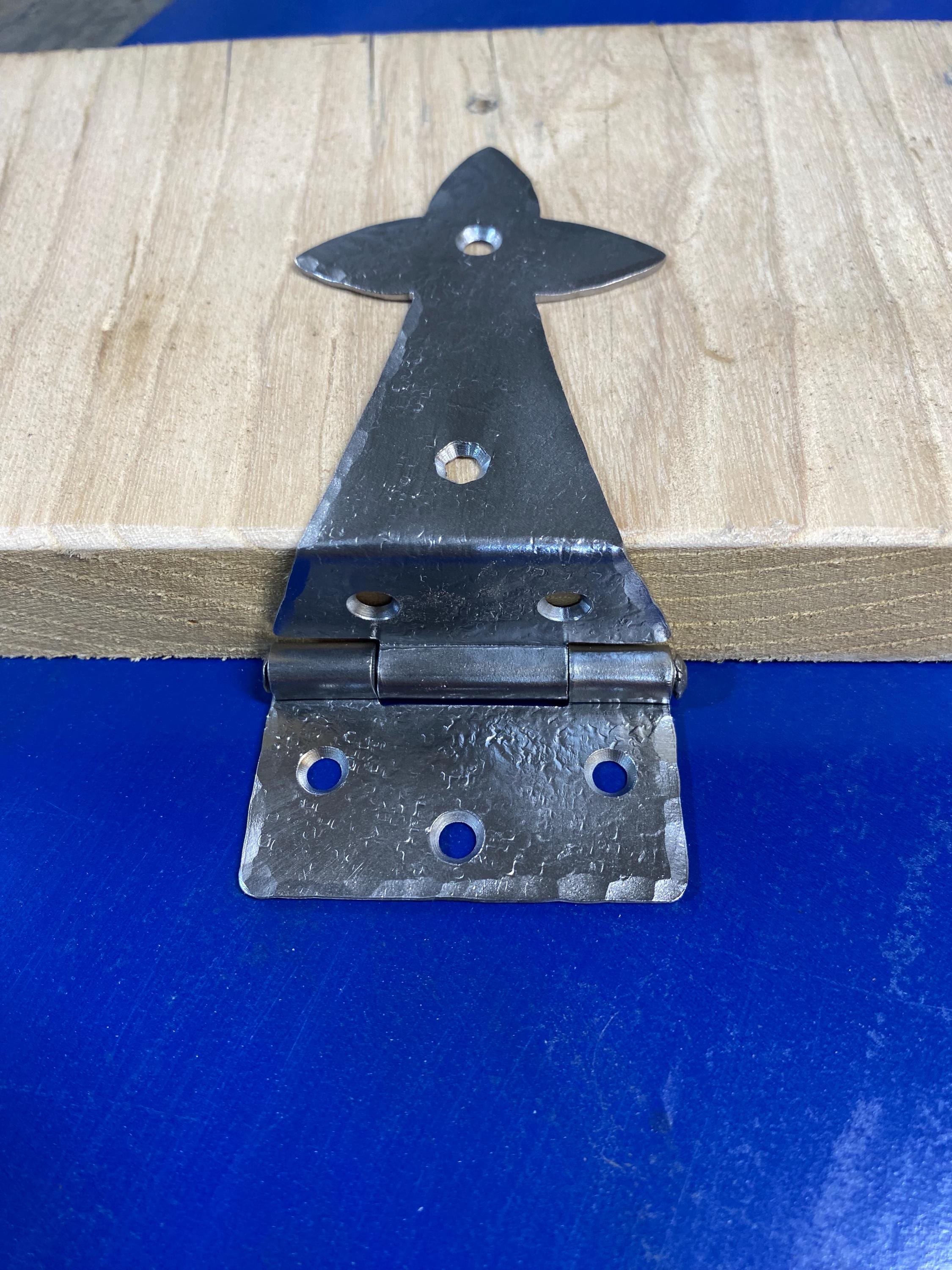 These hinges are 2” wide at the pin. Long leaf tapers down to the 3 point end. Made of 16 ga (1/16”) steel. All handmade.