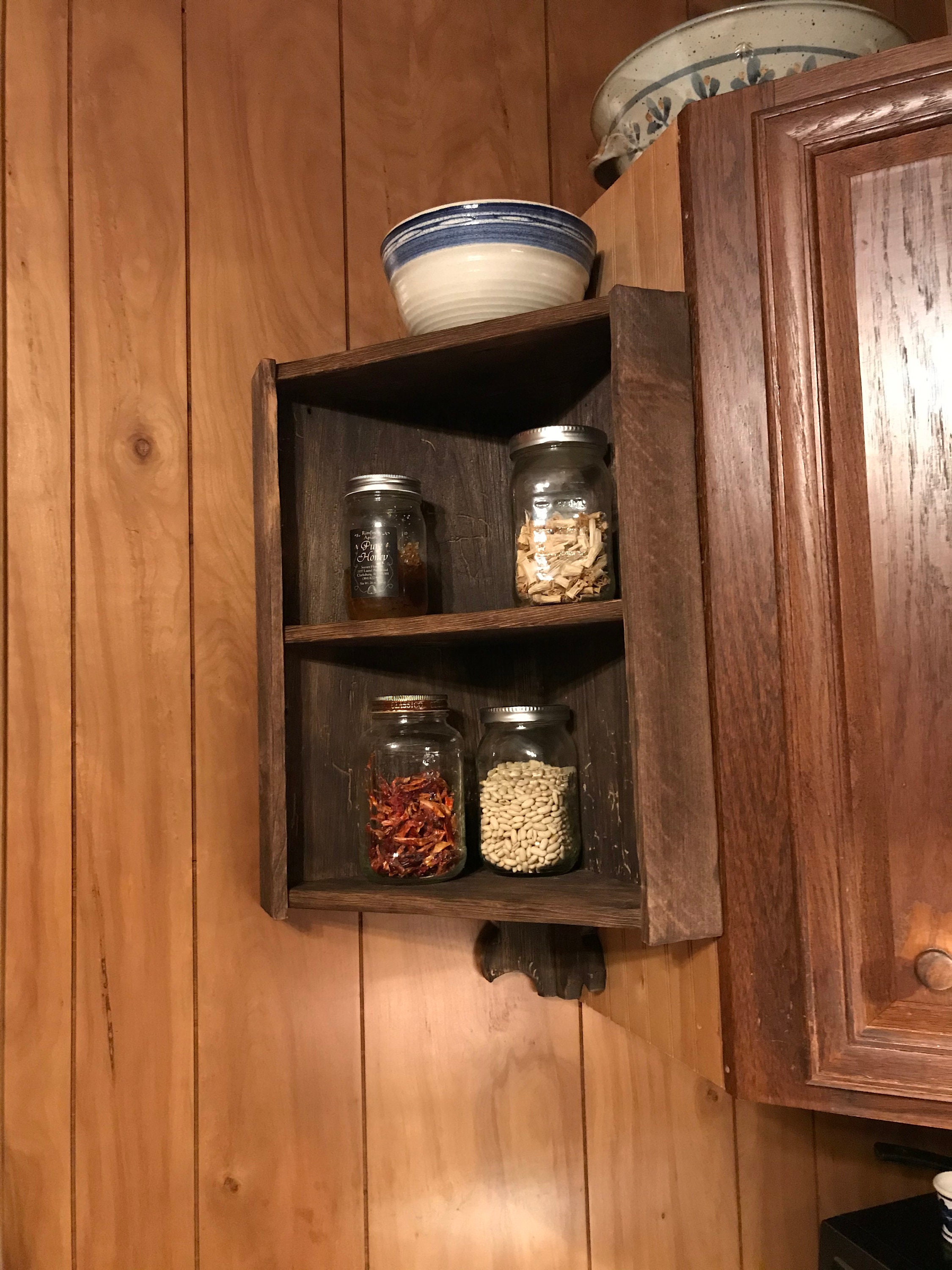One of our primitive early American style wall boxes. This piece is made of reclaimed barn wood taken from our own property. Made of poplar planks from the roof of an old milk house, they are over 100 years old. This is a basic corner cabinet or shelf design which adds beautiful to any country rustic farmhouse decor. Watch our listings for more designs and features soon to be added.