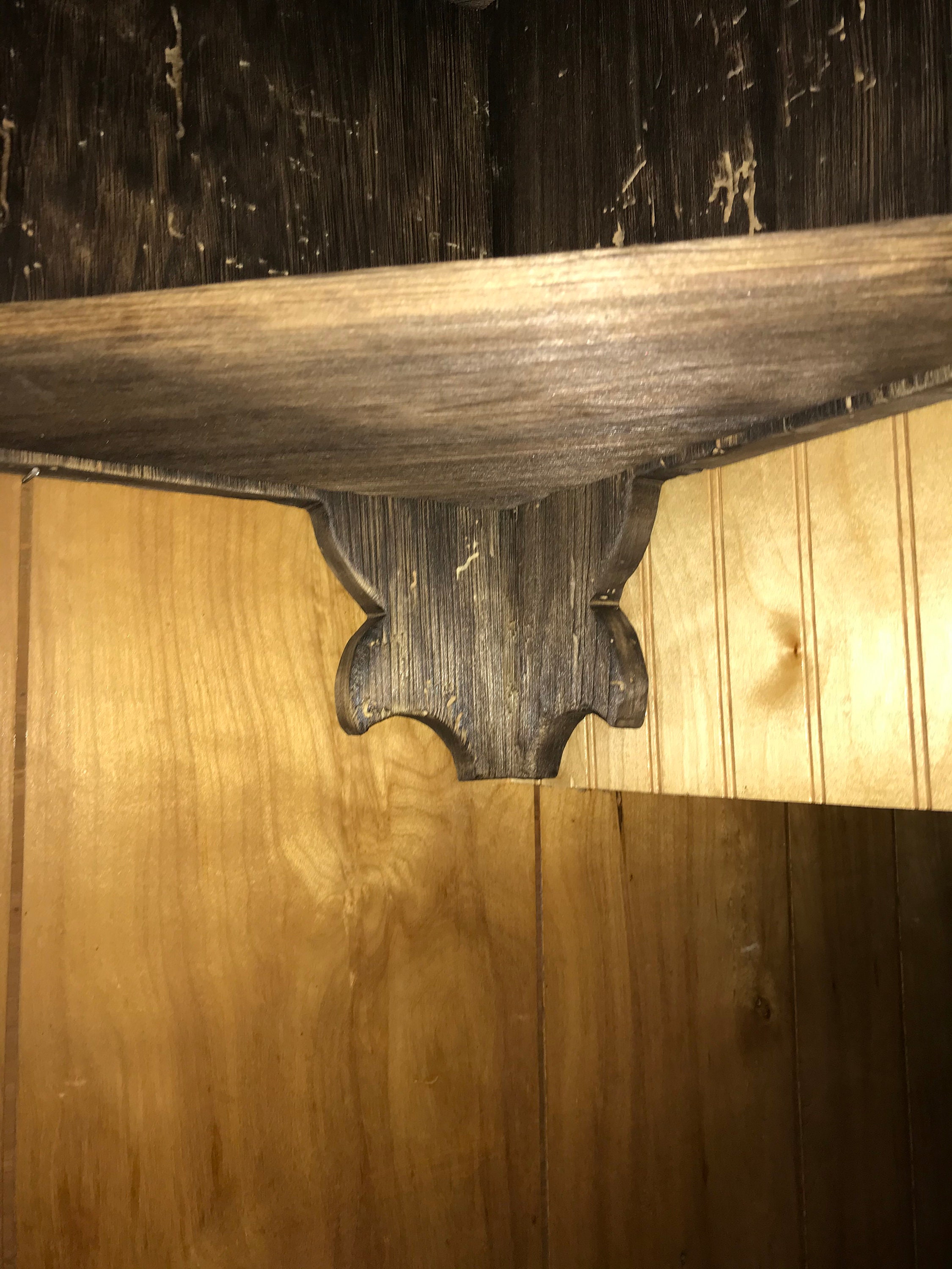 This corner wall shelf is unfinished and will continue to age beautifully.